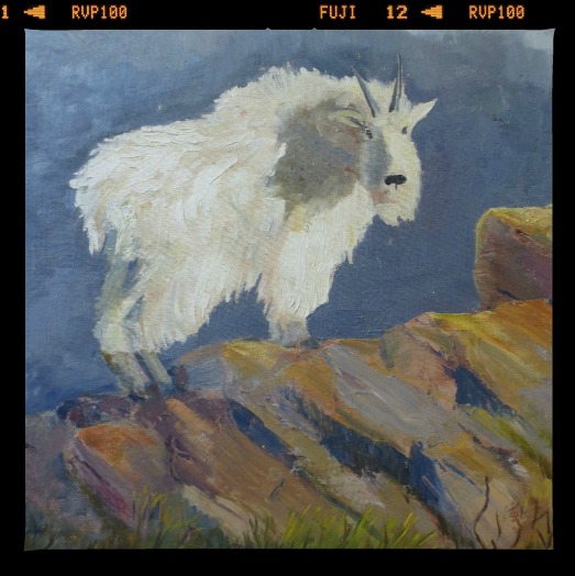 Well, I’m glad I did. I found this wonderful 1959 painting by F.G. Houston that had been put out the day before! It took me all of five seconds to know I was buying this beauty…a shaggy mountain goat perched on rock.