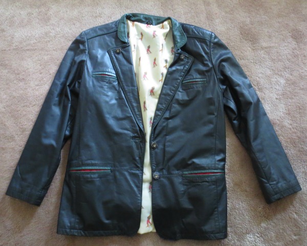 I enjoyed looking around, but honestly wasn’t going to buy anything…certainly not another black leather jacket! But the Austrian/German styling and workmanship on this was just too fabelhaft. I’ve seen jackets like this in wool or velvet, but never in leather. It’s got besom pockets trimmed in dark green leather and offset with red leather, horn buttons and the back features a belt detail and an open pleat.