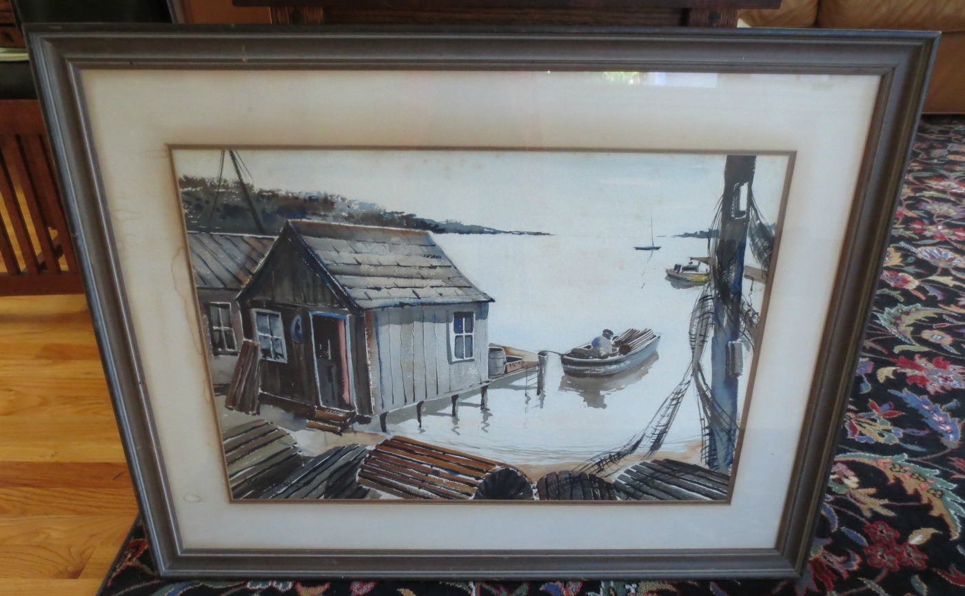 The painting is of a bay (in Maine?) with fishing boats, a shack and lobster traps.