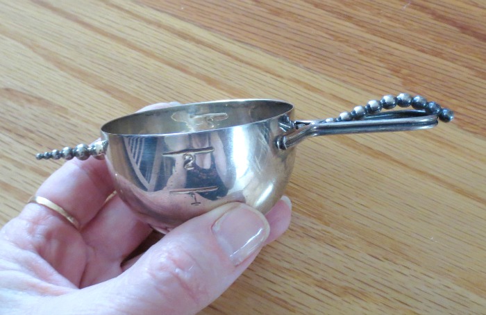 My first destination was at the “treasures” room in the very back of the property. This is typically where the best stuff is. The jewelry area in the room was immediately mobbed so I started perusing the other tables. The first thing I picked up was a cool silverplate jigger. I knew this was a quality item. (Later I noticed the tiny marks that it was made by Napier, pat. # 184638. It’s called a “bottoms up” jigger and these have sold for $40-$60 and two are currently listed on Etsy in the mid-$70s.)