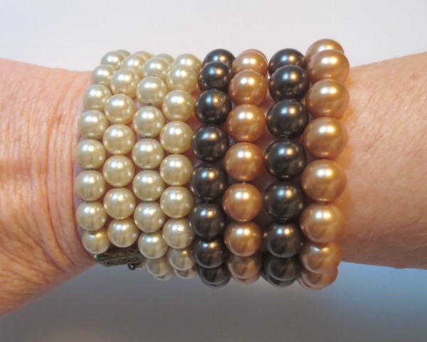 Thankfully most of this is in good condition and sellable. There are at several signed pieces (Sarah, Avon, Trifari, Lisner, Ban-Rol and Coro) and the hoop earrings are sterling silver. The three mid-century faux pearl necklaces have a nice weight and feel. I wrapped two of them around my wrist to see if they would work for impromptu bracelets…and they do!