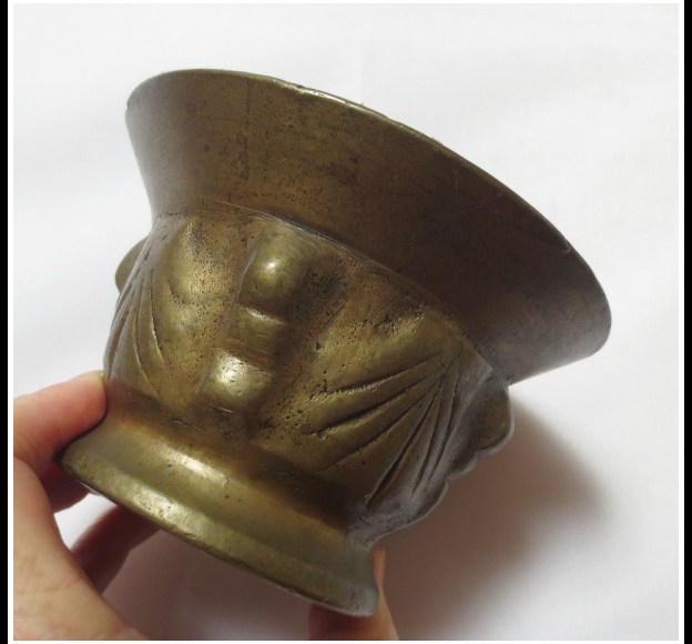 I discovered that brass mortar and pestles tend to come in three style varieties: those with two handles or knobs on the side, those with no handles and very minimal decoration and those with no handles and embellishments commonly including three vertical bumps or ridges.