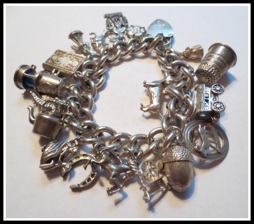 My biggest $$ buy lately was a loaded sterling silver charm bracelet. It arrived from England the other day after taking a rather interesting tour of the West Coast according to the postal tracking. I’ll be taking off the charms and selling them singly or in lots. One of the best charms on it is an acorn which opens to a squirrel. I like the miner’s lamp too.