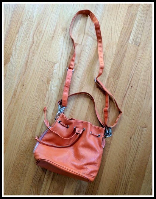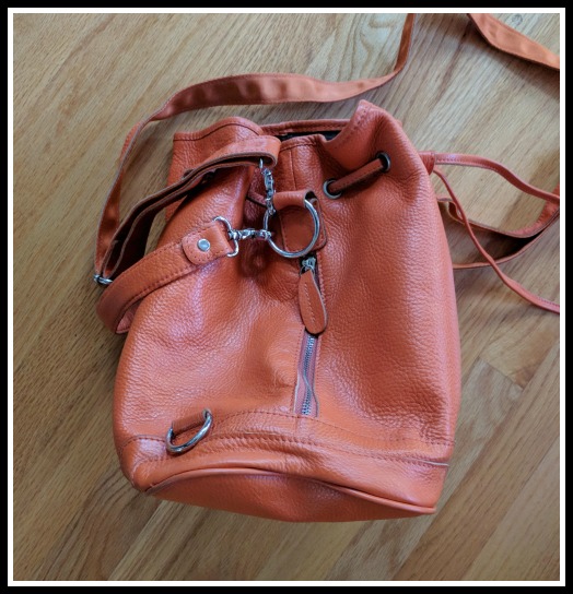 This visit I was lucky exchange-wise. First I spotted this orange leather bucket bag with two different, removable straps. I can’t find any maker info anywhere but it is well made of soft leather and in great condition except for two tiny scuffs on the bottom corners. Orange is not a color I wear, but as an accessory, I think it’s fun.