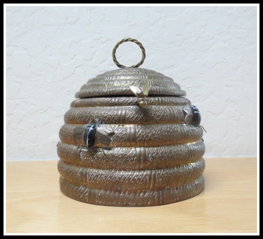 I thought this brass beehive biscuit tin was interesting and then when I flipped it over and saw the Mottahedeh company signature, it was a no-brainer. Someone has tried to polish this in the past and there are dried remnants of polish I will try to remove with a soft toothbrush. Sold prices over the years range from the $20s – $170, though most currently are listed at $60-$109.
