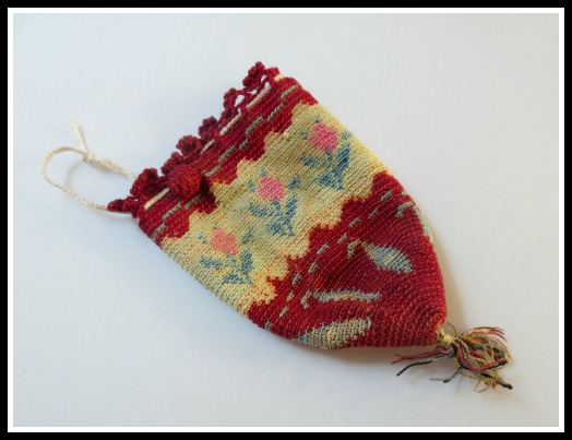 This item, also bought online, was listed as a doll’s purse, but I wasn’t convinced. It was small, yes, but not that small. After I received it I started doing some research and now believe it could be a miser’s purse (used back in the day to hold coins) or perhaps a young girl’s purse. It is quite charming though the drawstring is not original and it has a small repaired hole.