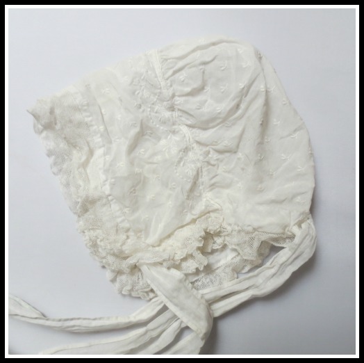 With some eBay Bucks (store credit) I bought this little antique embroidered bonnet. The seller said it was in “perfect condition.” Perfect condition consisted of several small holes and a stain. Humph! Still it is a nice enough piece though my photo here does not do it justice.
