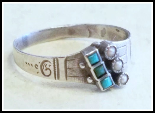 I won this charming baby ring of sterling silver, turquoise and pearls in an eBay auction. I’m hoping at size 3.5 it will work as a pinky ring or as a special ring for a girl. This one is still in the mail.