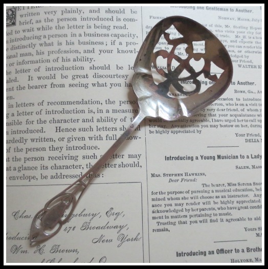 Did some research at home and discovered this is the “Pierced Handle” pattern by Manchester Silver Co., circa 1951. Pictured here are a preserves spoon, a cucumber slice spoon/server (who doesn’t need a cucumber server??) and the smallest is a bon bon spoon for your chocolate candy needs. I’m selling these as a set. By the way, replacements.com is a great resource for researching patterns of flatware, crystal, china, ceramics, etc. and for pricing. I usually try to list items a little lower than replacements’ prices.