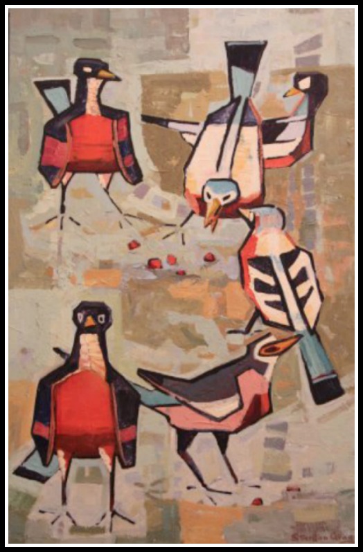 Did more research on Stanton and learned he was the head of the fruit science department at Cal-Poly University! (What??!) He and his wife Gladys, also an artist, were keen supporters of the San Luis Obispo Museum of Art. In fact they have a wing in their honor. (Yes, a wing!) Stanton died in 1974. The colors in my painting make me think it was painted in the late ’60s or early ’70s. This Stanton painting below titled “Party Time” is on permanent display in the museum. Love this one too.