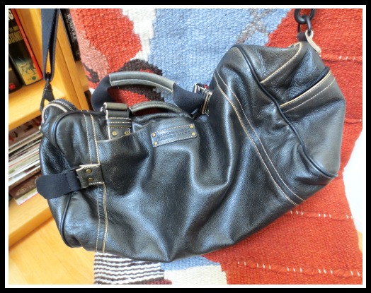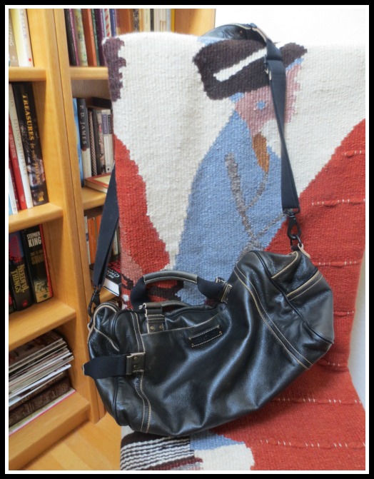 The other day I was perusing Craigslist to see if I could find well-priced vintage goodies for my Etsy store. Craigslist is not a huge source for me but I have found a few cool things over the years. Then I spotted something that might solve a travel problem I have. When I fly I typically check in my suitcase but still end up schlepping a big purse, a computer bag, and after security, a bag with a sandwich and a drink. By the time I board the plane I feel like a harried pack mule. (Maybe you know the feeling!) So I’ve been wanting to find a tote that could fit everything, but still squeeze under the seat. And I think I’ve found it…an Andrew Marc vintage-style, leather weekender duffle bag.