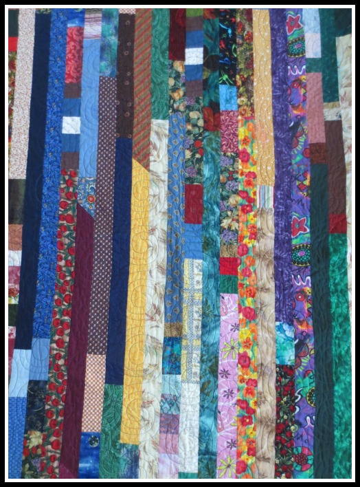 And one last online find was a vintage quilt (72.5″ by 84.5″) I won in an auction on Shopgoodwill for $48. It has a collage of wild cotton fabric strips sown together then quilted in a machine-stitched circular pattern.