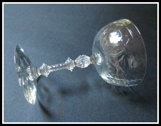 A few minutes later in the glass/crystal aisle I picked up four small champagne coupes. Just glass and unsigned, but their details charmed me. Besides the etched leaves, grapes and swags, the stems were so tactile with all these sharp-edged design bits.