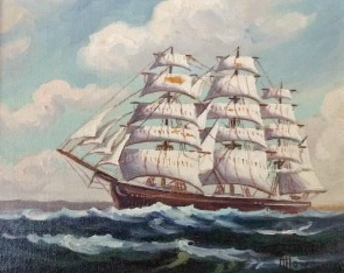 The son of Captain T Bailey Howe, master of a Nantucket whaler and painter, Harry Howe became an oil painter of marine and landscape subjects. He was born in Boston and remained based there most of his life, although he traveled widely. He took art lessons from his father. One of his favorite subjects was clipper ships…which were built respectively in Medford, Massachusetts in 1851 and Boston in 1850. This subject was popular in the East among persons who appreciated their importance to the history of that city.