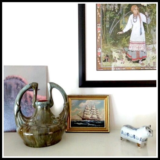 So in the few minutes I had before class I didn’t find anything in the pottery/china and metal aisles (my mainstays), but did spot this small ship painting at the end of the aisles. It was on the floor, leaned up against bigger paintings. Such a sweet thing (9″ by 7.75″) and a no brainer so I put it in my basket.