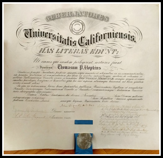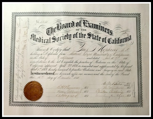 He then went to a University of California school for his medical training. This diploma comes complete with a bit of ribbon and is dated 1880 in latin.