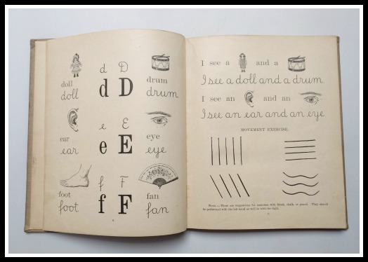 It’s not too often I buy things over 100 years old, so I get really excited when I do. Over a month ago I bought an 1899 school book called “The Baldwin Primer.” The cover is foxed and worn, but inside it’s clean and full of charming songs, illustrations, activities and pretty cursive.