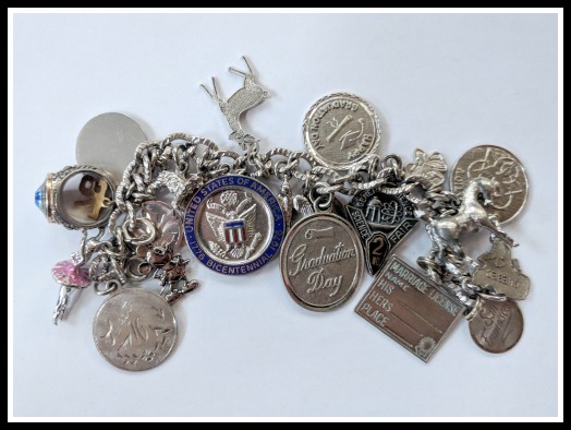 My mother started this silver charm bracelet for me when I was 10 years old. I was enchanted. The last charm she gave me was in ’92 when I got my master’s degree. She had it engraved.