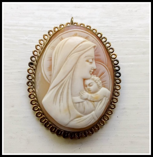 But I didn’t find anything that was knock-your-socks-off good, so this morning I popped into my neighborhood thrift store to try my luck. I noticed the jewelry cabinet was much fuller than usual and as I was perusing the shelves I spotted one thing that looked good, vintage good, and scurried to find an employee to unlock the cabinet for me. It was a carved shell cameo pin/pendant of Mary and Jesus, likely circa 1940/1960.