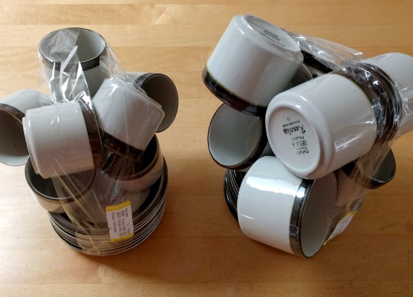 In shades of light gray and brown, they were made in the 1970s (designed by Anja Jaatinen-Winquist) and are now discontinued. Not uncommon or wildly valuable, but desirable. (There are eight cups and saucers in each $9.79 bundle. I’ll split these into lots of four, pricing them at $30-$40 a lot.)