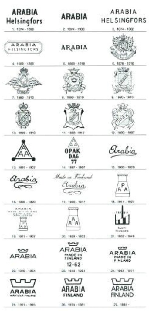 I always keep at eye out for items marked Arabia, a company founded in 1873 and still producing fabulous ceramics. The chart below shows the wide variety of their manufacturing marks over the decades. (You can see closeups at the Dishware Heaven website.)