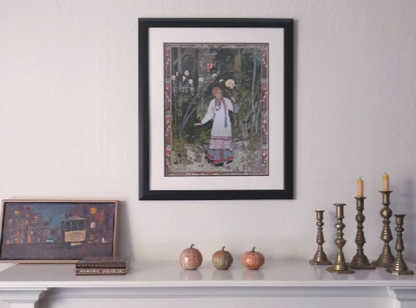 In the grouping below, I put my white Lin ceramic pumpkin on the Fortnum & Mason basket (given to me by my friend Lisa) and added my beloved mysterious tree painting by friend and artist Kevin Courter. The only thing for sale in this vignette is the huge 1970s wood frame.