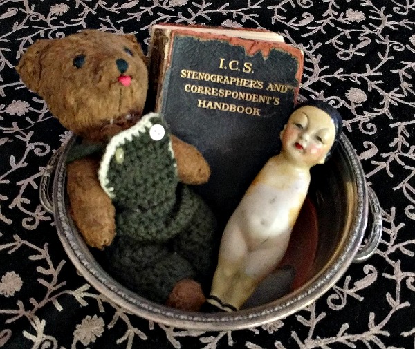 In this fabulous sterling silver bowl I bought from another Etsy seller, I added the little Chinese frozen Charlotte doll that I bought the other week at that challenging estate sale. It seems a perfect companion to my Dakin teddy bear (also bought from an Etsy seller!) who’s dressed for fall!