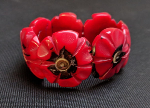 And this plastic red flower bracelet intrigued me. The flower panels are handmade as each is slightly different in shape, carving and painting and they look vintage. They did not test positive for bakelite (drat!) so they’re possibly celluloid. Either way I love the way it looks. Reminds me something that might be worn in the ’40s.
