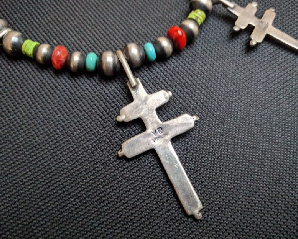 But my best find was this cross and bead necklace. The seven crosses are marked sterling and signed VB for Vernon or Virgil Begay, Navajo silversmiths. It is a striking statement piece and even though I paid up for it, I think it has a lot more meat on the bone. I’m darn tempted to keep it and wear it for a while!