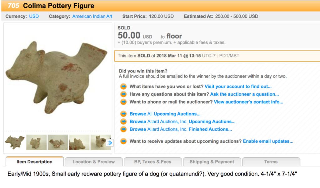 In several of the dog searches I noticed the depiction of the distinctive Colima dog which has large pointed ears as mine does and many with the same grimace. But my pot or vessel isn’t shaped like typical Colima dog vessels.