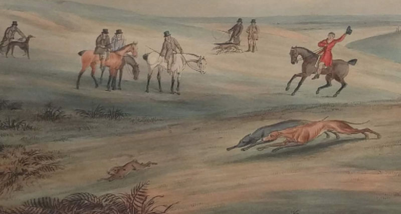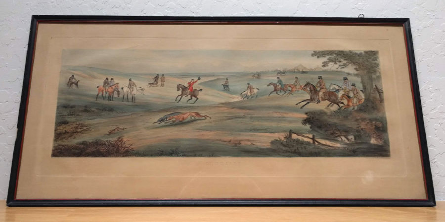George Maile (1800 -1842) and Thomas Sutherland (1785-1838) were artists known for engravings. In 1823 the pair produced “a series of four magnificent colored aquatint engravings of sporting subjects measuring 27.5 by 11 inches….” Subjects included: Coursing, Fox Hunting, Stag Hunting and Hare Hunting. They were “magnificent impressions of an excessively rare set with full margins.”