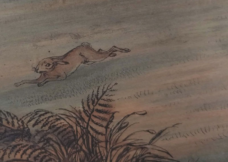George Maile (1800 -1842) and Thomas Sutherland (1785-1838) were artists known for engravings. In 1823 the pair produced “a series of four magnificent colored aquatint engravings of sporting subjects measuring 27.5 by 11 inches….” Subjects included: Coursing, Fox Hunting, Stag Hunting and Hare Hunting. They were “magnificent impressions of an excessively rare set with full margins.”