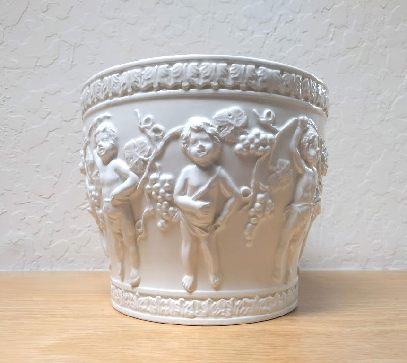 These days I’m focusing mostly on smaller items (8″ and under) that are easier to store and ship, but sometimes I have to say yes to larger pieces! This past week I definitely said yes to this Italian-made putti and grape decorated pot. It’s been used as a planter (I’ll give it a good soaking), but it doesn’t have a drainage hole.