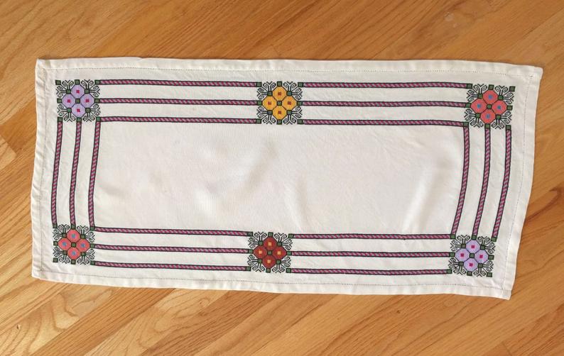 I bought this lovely table runner/dresser scarf with Art-Nouveau style petit point at a yard sale last June and finally got it listed! It has a few small, light stains which someone more skilled may be able to remove.
