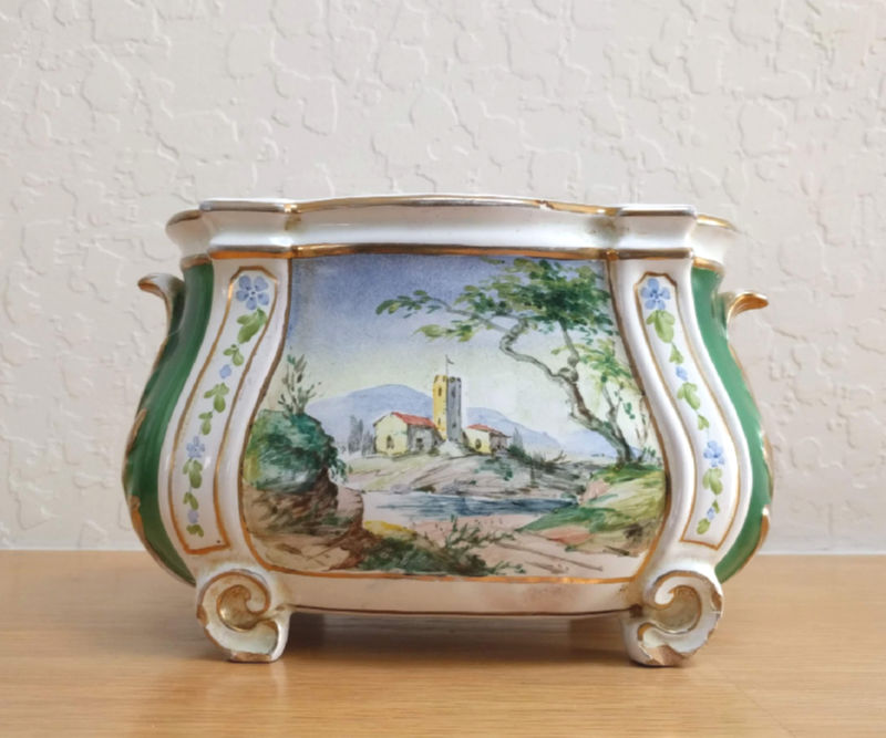 This hand-painted ceramic planter, a thrift store find, has some age (I’m guessing 80+ years) and intriguing marks on the bottom It’s not my style or what I’m looking for these days but so sweetly Old World that even with the chipped feet, I thought it was worth saving and finding a new home. I can picture it in a kitchen corralling wooden spoons. Or how about on a mantel with old love letters?