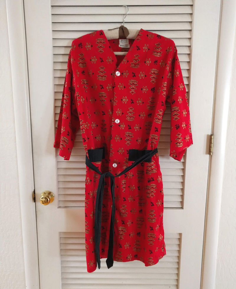 A few days ago I finally got this 1950s/1960s men’s shaving coat ironed and listed. It had been languishing in one of my piles for three years. I let that sink in. Three years. Now here’s the kicker–it sold in less than two hours! ($35 with free shipping) It’s now on its way to Miami.