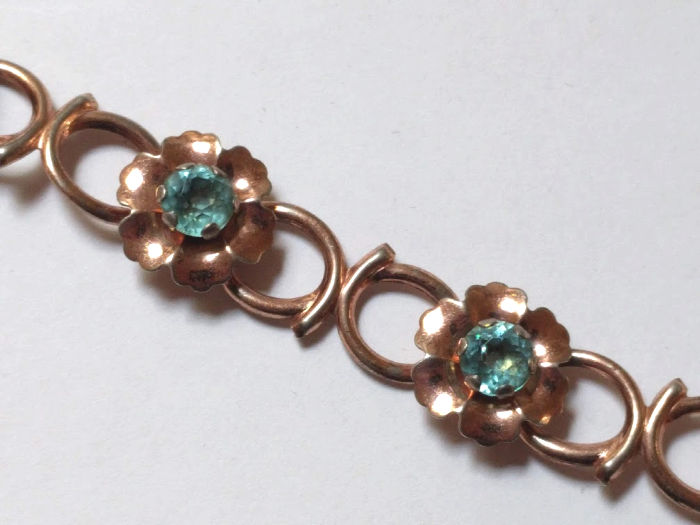 The other bag had three vintage bracelets. One was marked Trifari, but had two missing rhinestones. One was junky. And the other is nice enough to sell but nothing stupendous. The clasp is marked sterling and I’m going to test to see if the metal beneath the copper finish is sterling as well. No maker’s mark.
