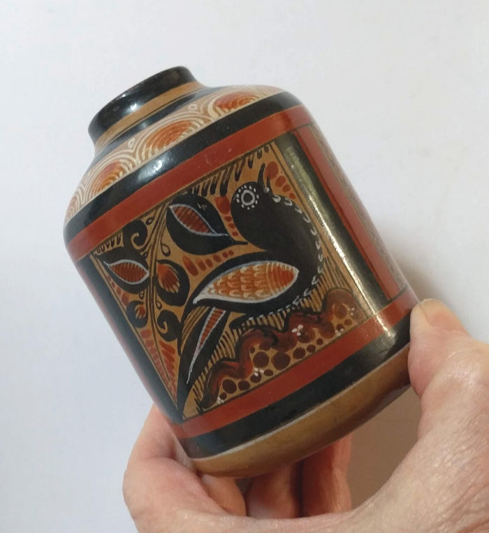 And this little burnished pottery vase, likely from Mexico, was a “heart buy.” I loved its sweet birds, colors and deliciously smooth finish.