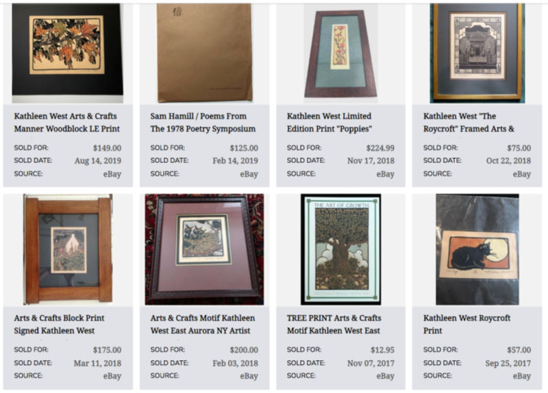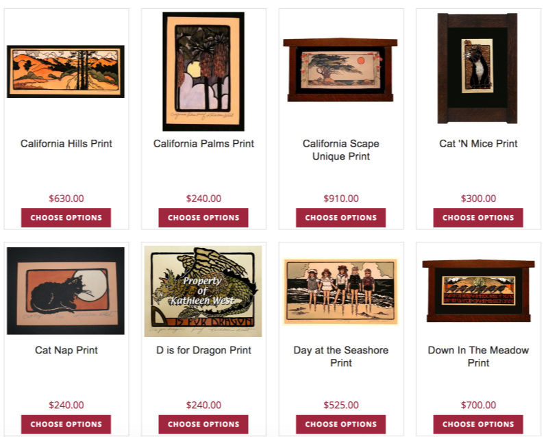 ….an American print maker that has been inspirational to many artist of today’s Arts & Crafts movement. Kathleen has over 50 years of hard work and inspiration in developing her craft, which helps her stand out from other print makers in the Arts & Crafts style. All of Kathleen West’s prints involve designing, drawing and cutting a block. Once this process is complete, Kathleen will hand-print and hand-color with the use of a wooden spoon technique and watercolors.