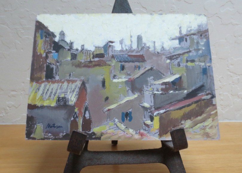 I bought a Rip Matteson (1920-2011) from an eBay seller a few years back. Matteson is best known for his nudes (that sell in the upper hundreds to thousands of dollars), but I thought this small gouache cityscape was intriguing too. The original matting was stained and the frame lackluster so I got rid of them. Later, by kizmet, I found this gray distressed frame and mat that both fit and suited the painting perfectly. I’m still enjoying this one and am not sure what my listing price will be.
