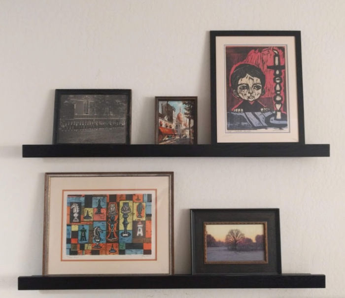Here are the two picture rails in our living room where I rotate pieces of art. The two wood-cuts are by Irving Amen and the landscape is by plein air artist and friend Kevin Courter.