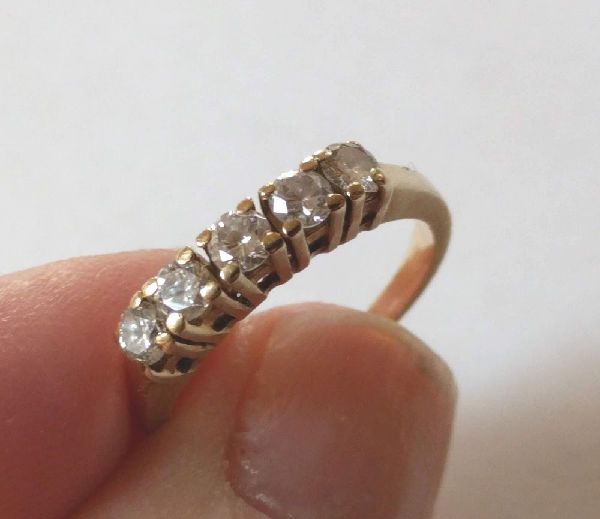 The downside for me in purchasing precious metals and gems is my lack of knowledge. Take for example the ring with five small diamonds. I know nothing about size, cut, color and clarity of diamonds, nor can I head out to a local jeweler to find out. The stones do have good flash. I ended up basing my price for this ring by researching rings of similar age, quality and size.