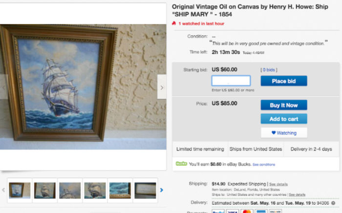 The seller did mention that she had been trying to sell the paintings for a neighbor but no one had been interested in them until I came along. That did give me pause. Had the market for this artist’s work dropped? Were ship paintings passé now? I did a bit of research and my fears seem unfounded. I’m guessing that these paintings just hadn’t been discovered yet!