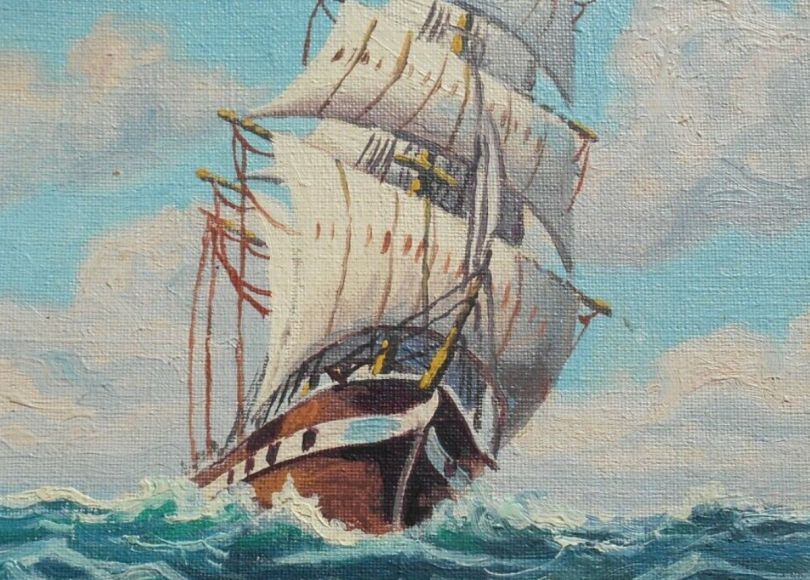 The seller did mention that she had been trying to sell the paintings for a neighbor but no one had been interested in them until I came along. That did give me pause. Had the market for this artist’s work dropped? Were ship paintings passé now? I did a bit of research and my fears seem unfounded. I’m guessing that these paintings just hadn’t been discovered yet!
