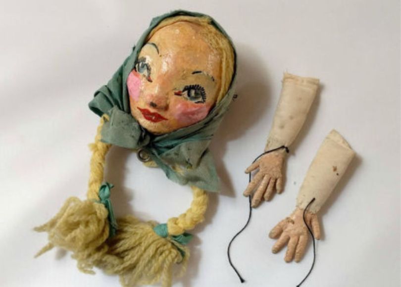 I found this puppet (she did come with a disintegrating cloth body) at an estate sale. I was number 36 in the door and it was tough picking. Many of the things left were unpriced and quite a few were jumbled with other things in cardboard boxes. There were a fair number of items, like this Swiss Miss puppet, that were in sad condition. Still given her age, I thought someone might want to use the paper mache parts of her for a project. She sold surprisingly quickly.