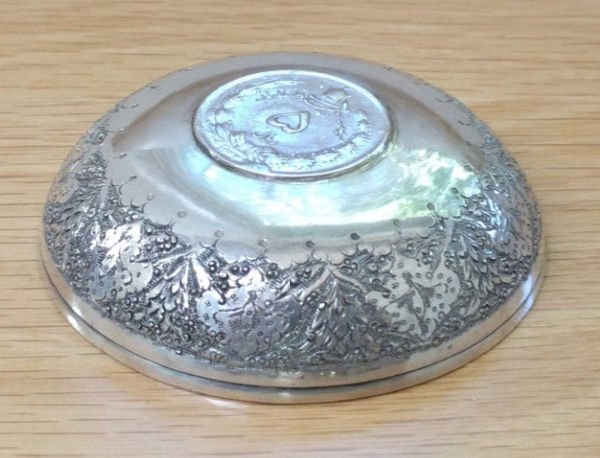 Most of the other items I donated, though I did hang onto the pretty Persian bowl with an inset rial coin. Well this past June I decided it was time to list the bowl but first I did an acid test on it. To my surprise, it tested positive for sterling silver! I tested it several more times always scratching from the same area, assuming if it was just plated I would finally get to the base metal…but it always tested positive. That was a lovely discovery.
