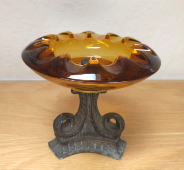 Until the pandemic restrictions ease a bit I’m not foraging too widely, but my neighborhood thrift is still yielding bits and pieces. The other day, I thought this 1960s/70s ashtray was one to save. The amber glass is in beautiful condition and has slots for 12 cigarettes! Twelve! This piece harkens back to a time of women in wiggle dresses and men with skinny ties and cocktails a plenty in a smoky room.