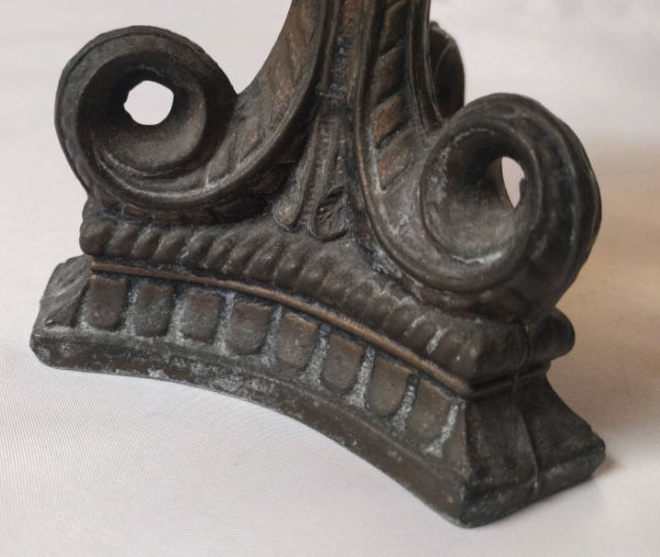 The base which I believe is cast iron has lost most of its original gilding and has corrosion. At some point this must have been stored in a damp/wet environment, but the weird thing is I like the metal better exposed like this. It’s more interesting and a bit goth.