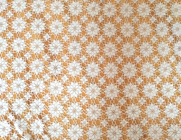 I immediately gravitated to a clothes rack with tablecloths. This crocheted one particularly caught my eye. (One of the volunteer staff helped me unfurl it for a closer look.) It was huge (112″ by 57″) and other than a few light stains was in lovely condition. It was the best of the bunch and I had her set it aside for me. (Which was a darn good thing as a few ladies came in and grabbed the other two!)