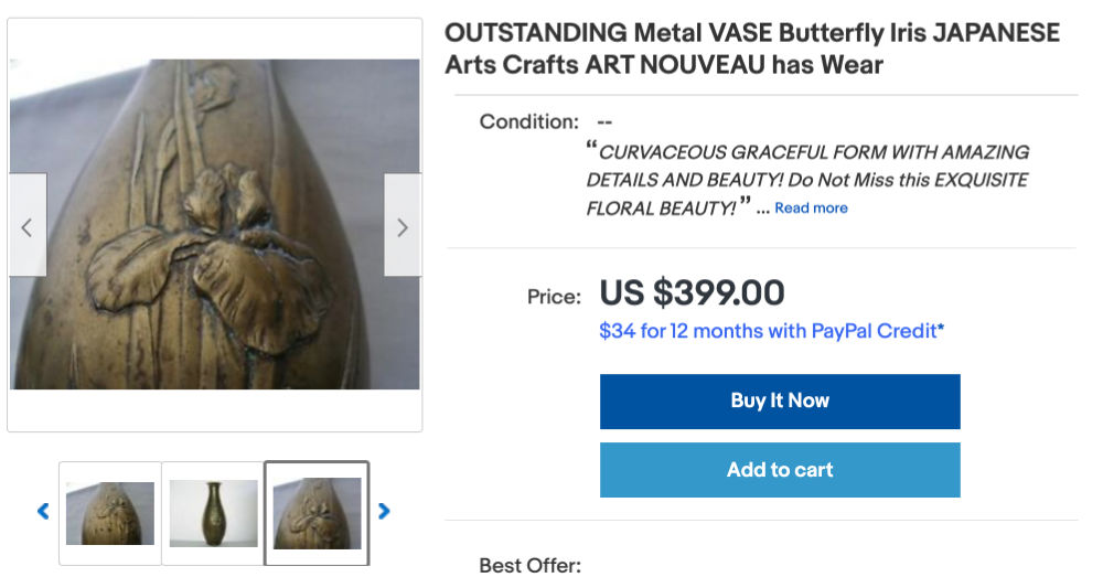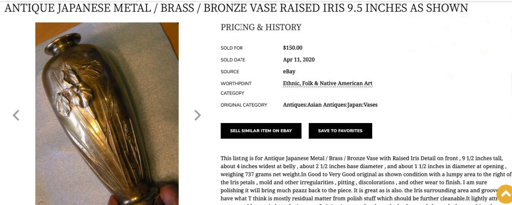 Other than a few green corrosion spots (which can be polished away), my vase is in darn good condition. I’ll likely list it for $100-$125.
